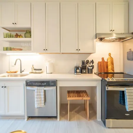 A toaster, oven, and a dishwasher are featured in a kitchenette area. Inkwell Charlotte Apartment provides access to the 36th Street city rail.