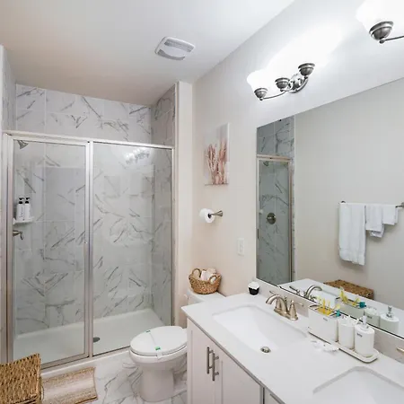 This Charlotte villa comes with a bathroom with a walk-in shower, a separate toilet, and a sink. A hair dryer, a shower cap, and bath sheets are included for added comfort.