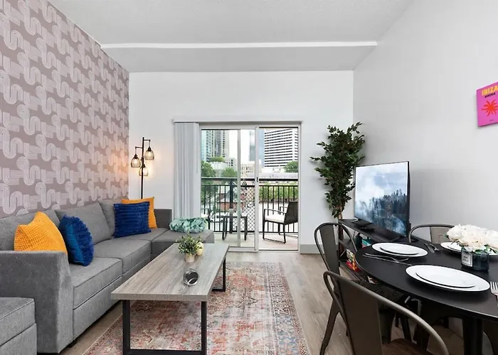 Located in the Downtown Charlotte district, the 125 ft² Stylish 4 Bed - 2 Mins To Stadium - Free Parking - Gym - Views Charlotte apartment is only a 6-minute walk from the Uptown-area BB and T Park Stadium and 0.6 miles from The Bank of America Stadium, which is recommended to be visited by sports fans. Wi-Fi and free private parking are also available at this 2-bedroom apartment.
